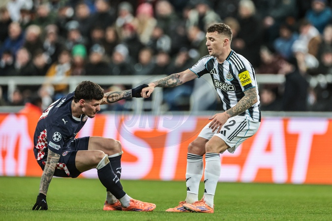 Kieran Trippier of Newcastle Untied gives Dennis Man of PSV Eindhoven a hand up during the UEFA Champions League Matchday 7 of 8 Newcastle United v PSV Eindhovenn at St. James's Park, Newcastle, United Kingdom, 21st January 2026, Credit:Mark Cosgrove/News Images / Avalon