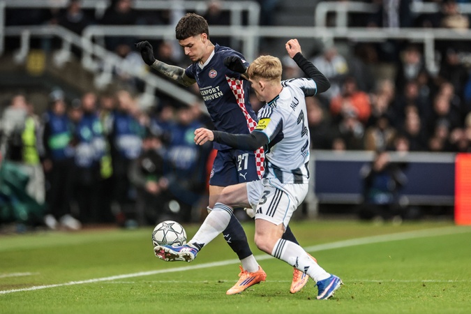Dennis Man of PSV Eindhoven and Lewis Hall of Newcastle Untied battle for the ball during the UEFA Champions League Matchday 7 of 8 Newcastle United v PSV Eindhovenn at St. James's Park, Newcastle, United Kingdom, 21st January 2026, Credit:Mark Cosgrove/News Images / Avalon