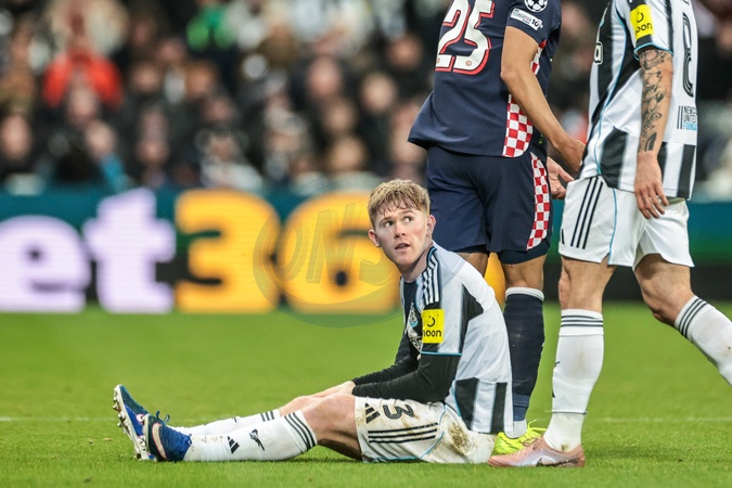 Lewis Hall of Newcastle Untied takes a knock during the UEFA Champions League Matchday 7 of 8 Newcastle United v PSV Eindhovenn at St. James's Park, Newcastle, United Kingdom, 21st January 2026, Credit:Mark Cosgrove/News Images / Avalon