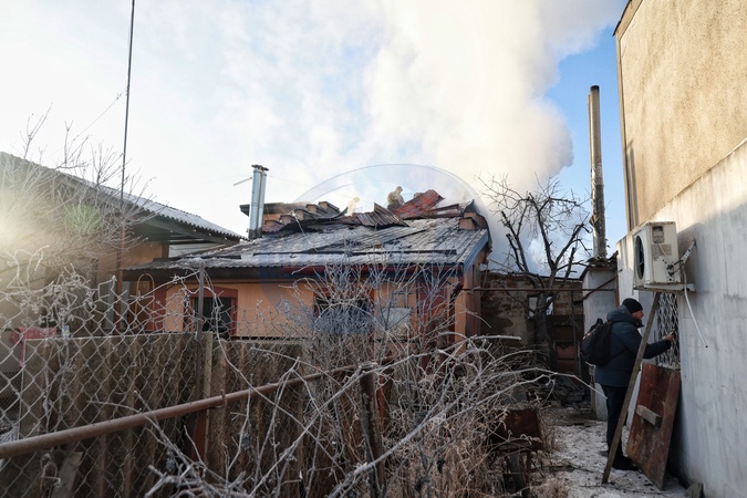Firefighters extinguish a fire on the roof of a house that broke out following a Russian drone attack in Oleksandrivka, Odesa region, Ukraine, on January 21, 2026, Credit:Nina Liashonok / Avalon