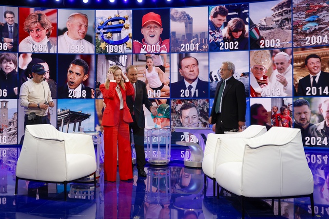 January 21, 2026, Rome, Rai, Porta a Porta broadcast, in the photo Bruno Vespa and Enrico Mentana interview Giorgia Meloni, Credit:Cristiano Minichiello / Avalon