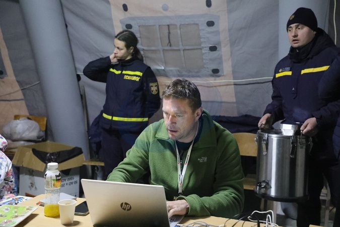 A man works on a laptop in the presence of emergency responders at a mobile heating point of the State Emergency Service of Ukraine deployed in the Voskresenka residential area, Kyiv, Ukraine, on January 21, 2026, Credit:Yuliia Ovsiannikova / Avalon