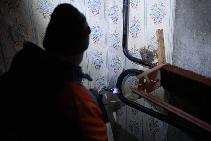 Repair workers of Ukrzaliznytsia help municipal services thaw frozen pipes in a residential building in Kyiv's Holosiivskyi district, Kyiv, Ukraine, on January 21, 2026. Following Russian attacks on energy infrastructure, around 3,000 apartment buildings in the capital remain without heat. Emergency power cuts are ongoing as utility and energy workers work nonstop to restore heating and electricity, Credit:Danylo Antoniuk / Avalon