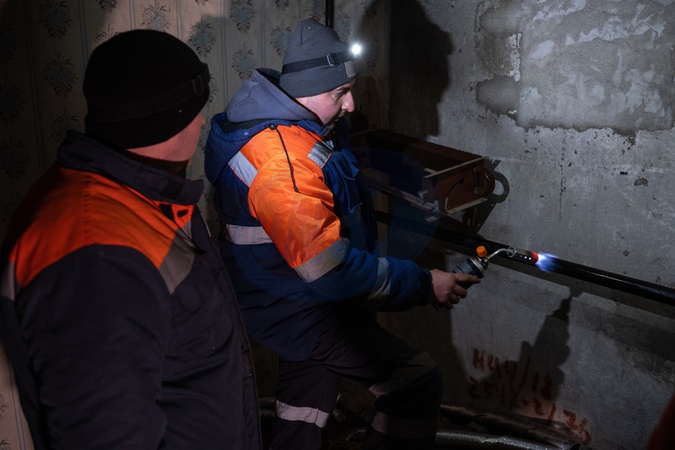 Repair workers of Ukrzaliznytsia help municipal services thaw frozen pipes in a residential building in Kyiv's Holosiivskyi district, Kyiv, Ukraine, on January 21, 2026. Following Russian attacks on energy infrastructure, around 3,000 apartment buildings in the capital remain without heat. Emergency power cuts are ongoing as utility and energy workers work nonstop to restore heating and electricity, Credit:Danylo Antoniuk / Avalon