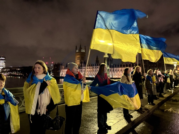 London, UK. 22 January 2026. Ukrainians and supporters form a human chain on Westminster Bridge during a Unity Day (Sobornist) rally, marking the anniversary of Ukraine's national unity. The demonstration, organised by pro-Ukraine groups, highlights solidarity with Ukraine and calls for continued international support amid the ongoing war., Credit:Alexander Seale / Avalon
