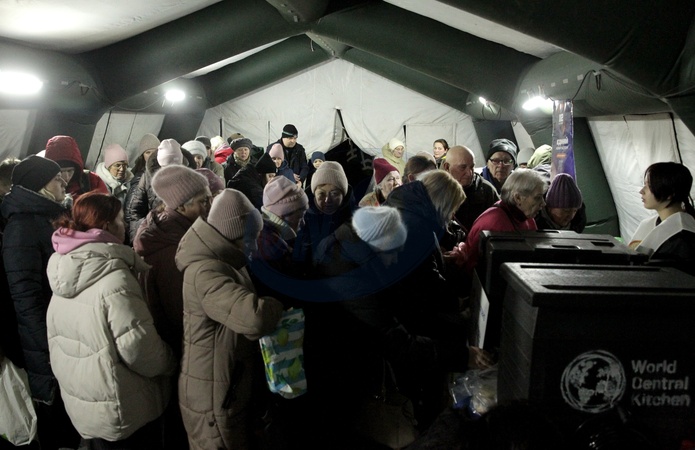 People receive free hot meals from the charity World Central Kitchen at a mobile heating point in the Desnianskyi district of Kyiv, Ukraine, on January 22, 2026. The heating point was deployed amid power and heating outages after Russian attacks on energy infrastructure, Credit:Hennadii Minchenko / Avalon