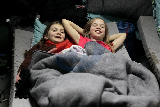 Girls rest at a mobile heating point in the Desnianskyi district of Kyiv, Ukraine, on January 22, 2026. The heating point was deployed amid power and heating outages after Russian attacks on energy infrastructure, Credit:Hennadii Minchenko / Avalon