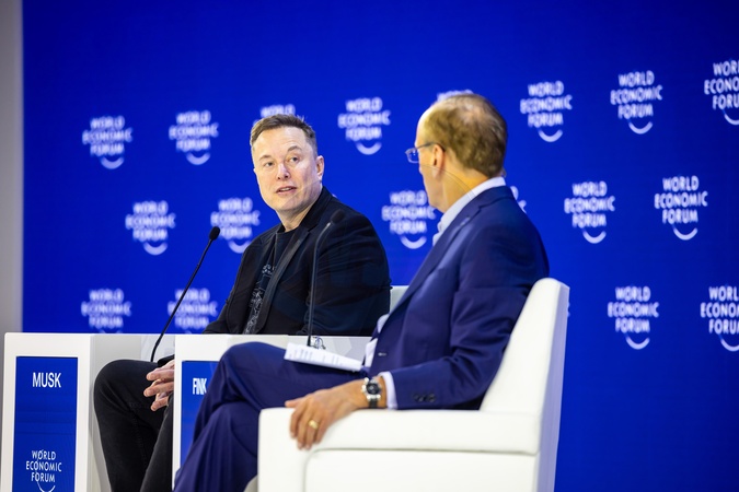 Elon Musk in conversation with Laurence D. Fink, Chair and CEO of BlackRock at the World Economic Forum 2026 Annual Meeting in Davos, Switzerland, Credit:World Economic Forum / Avalon