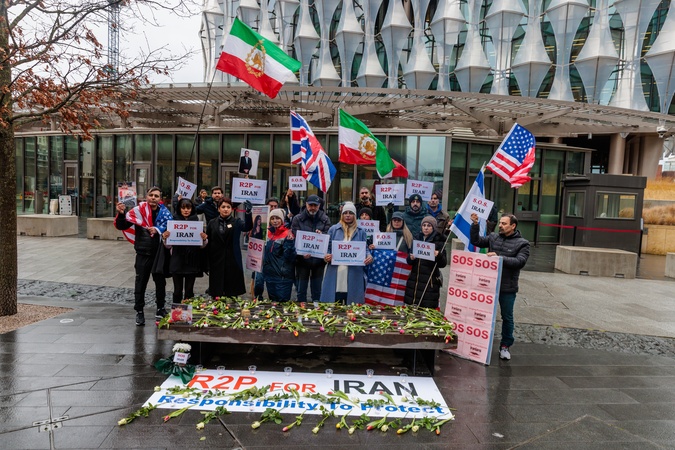 US Embassy, London, UK. 23rd January 2026.On Day 7 of her hunger strike outside the US Embassy in London, former political prisoner, Nasrin Roshan, and supporters, held a minute's silence for the victims of the Islamic Regime in the current protests in Iran.Released from Evin Prison for the second time just over 7 months ago, knowing first hand the brutal torture by the regime, Roshan is demonstrating on behalf of Elvin prisoners on the worldwide silence by governments on the mass killings by the Islamic Republic., Credit:Photo by Amanda Rose / Avalon