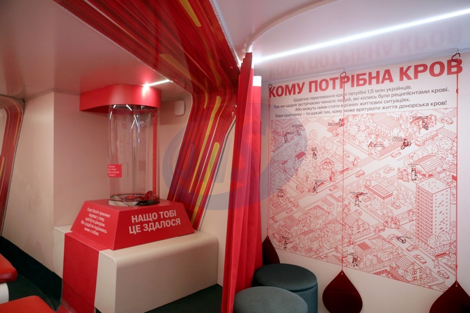 An interactive exhibition on blood and donation is open on the first floor of the Teplokrovni mobile donor hub in Kyiv, Ukraine, on January 22, 2026. Blood donation takes place on the second floor of the hub as part of events dedicated to Ukraine's Unity Day, while a waiting area for donors has been arranged at the National Opera of Ukraine, Credit:Volodymyr Tarasov / Avalon