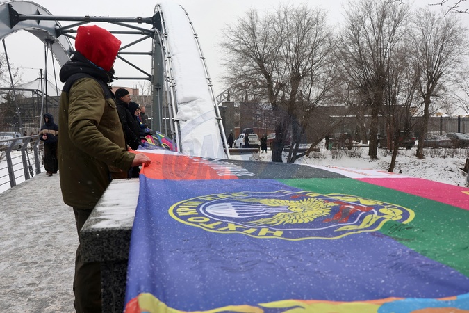 Activists unfurl a 70-meter flag made from banners of military units from the Anti-Terrorist Operation (ATO) period on the Zoolohichnyi Bridge to mark Ukraine's Unity Day in Kharkiv, Ukraine, on January 22, 2026, Credit:Viacheslav Madiievskyi / Avalon