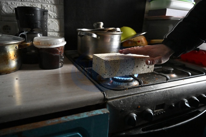 A brick is heated on a gas stove to warm a room in an apartment of a residential building on Ihor Shamo Boulevard in the Dniprovskyi district of Kyiv, Ukraine, on January 23, 2026. Following Russian attacks, the building has been without heating since January 9, while extended heating and power outages have lowered indoor temperatures to +2°C and left elevators out of service, Credit:Yevhen Kotenko / Avalon
