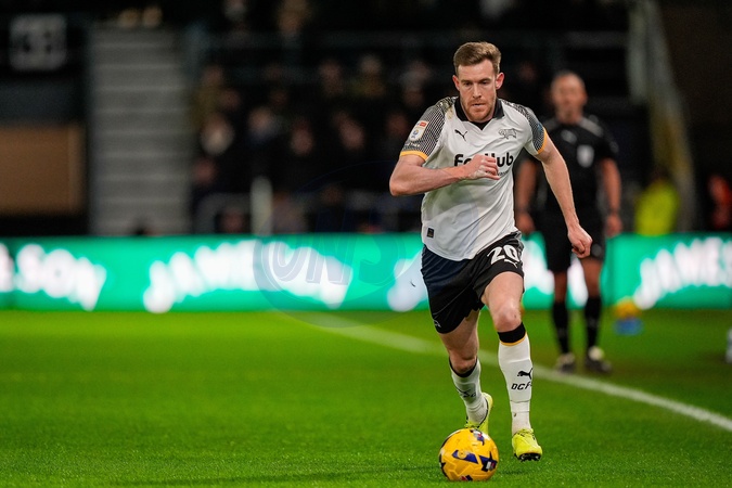 Callum Elder of Derby County makes a run with the ball during the Sky Bet Championship match Derby County vs West Bromwich Albion at Pride Park Stadium, Derby, United Kingdom on 23 January 2026, Credit:Maynard Manyowa/News Images / Avalon