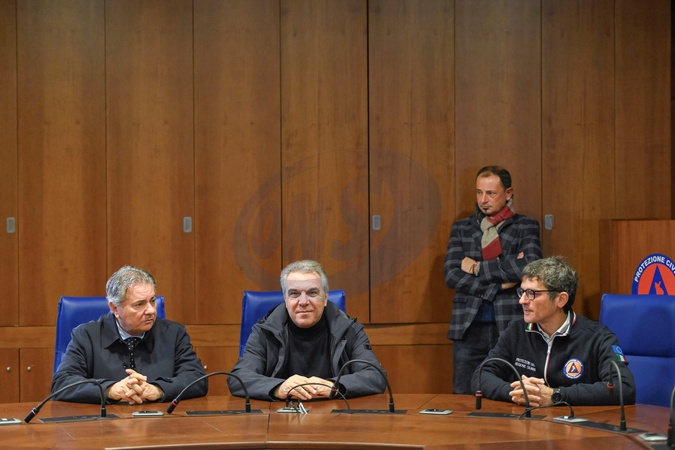 Following Cyclone Harry, the Undersecretary to the Presidency of the Council of Ministers met with Civil Protection personnel at the Catanzaro headquarters. Pictured: From left: Filippo Mancuso, Vice President of the Calabria Region; Luigi Sbarra, Undersecretary to the Presidency of the Council of Ministers; Domenico Costarella, Director General of Civil Protection for Calabria. Catanzaro, Italy 24 January 2026, Credit:Valeria Ferraro / Avalon