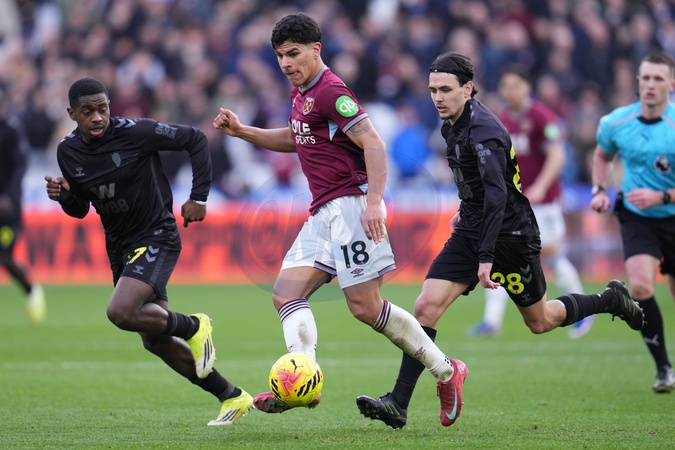 Mateus Fernandes of West Ham United attempts pass under pressure during the Premier League match West Ham United vs Sunderland at London Stadium, London, United Kingdom, 24th January 2026, Credit:Harvey Murphy/News Images / Avalon