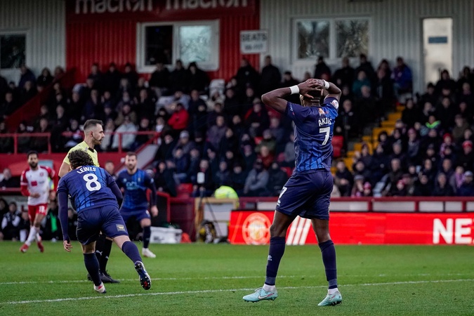 Lucas Akins of Mansfield Town reacts after a missed chance on goal during the Sky Bet League 1 match Stevenage vs Mansfield Town at Lamex Stadium, Stevenage, United Kingdom, 24th January 2026, Credit:Maynard Manyowa/News Images / Avalon