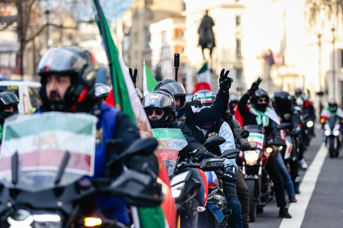 Iranian motorcyclists ride past during a vigil for victims of protests in Iran outside Downing Street in London, UK, on 24 January 2026., Credit:Pete Speller / Avalon