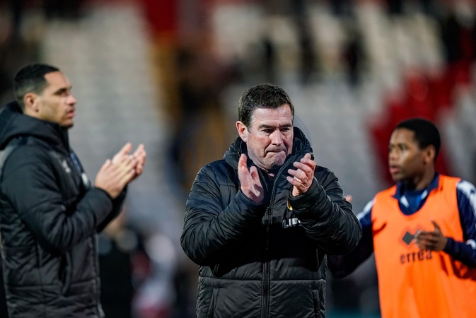 Mansfield Town manager Nigel Clough dejected applauds the fans after the final whistle during the Sky Bet League 1 match Stevenage vs Mansfield Town at Lamex Stadium, Stevenage, United Kingdom, 24th January 2026, Credit:Maynard Manyowa/News Images / Avalon