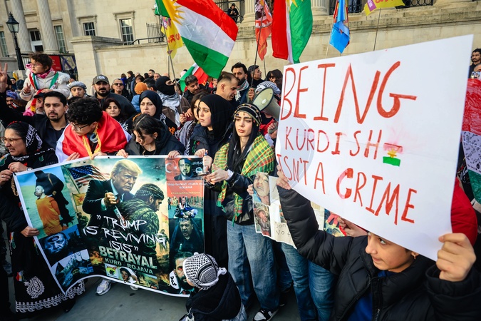 Kurdish protesters march from Trafalgar Square to Downing Street in London, UK, on 24 January 2026, holding placards calling for freedom for Rojava and protection for Kurdish communities in Syria., Credit:Pete Speller / Avalon