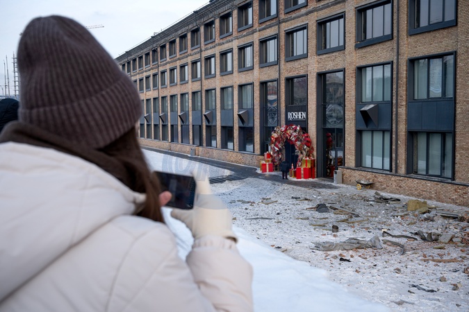 A woman takes pictures with a smartphone outside a confectionery factory affected by a Russian attack, Kyiv, January 24, 2026. The Roshen confectionery factory in Kyiv's Holosiivskyi district was damaged in a large-scale overnight Russian strike on January 24, 2026. One employee was killed, two others were injured, and both production and office buildings sustained damage., Credit:Danylo Antoniuk / Avalon