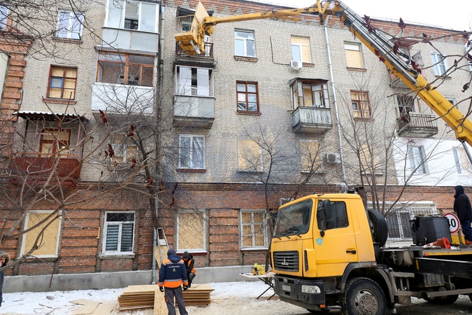 Repairmen use an aerial work platform to seal windows in an apartment block smashed by a Russian drone strike with OSB boards, Kharkiv, Ukraine, January 24, 2026. The overnight Russian attack left 27 people injured. Residential buildings, a maternity hospital, and a dormitory were also damaged., Credit:Viacheslav Madiievskyi / Avalon