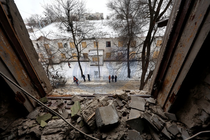People stay in the street as seen through a window in an apartment block knocked out by a Russian drone strike, Kharkiv, Ukraine, January 24, 2026. The overnight Russian attack left 27 people injured. Residential buildings, a maternity hospital, and a dormitory were also damaged., Credit:Viacheslav Madiievskyi / Avalon