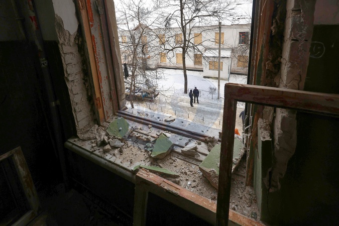 People stay in the street as seen through a window in an apartment block knocked out by a Russian drone strike, Kharkiv, Ukraine, January 24, 2026. The overnight Russian attack left 27 people injured. Residential buildings, a maternity hospital, and a dormitory were also damaged., Credit:Viacheslav Madiievskyi / Avalon