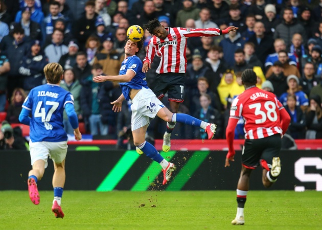 Jacob Greaves of Ipswich Town and Andre Brooks of Sheffield United duals for the ball during the Sky Bet Championship match Sheffield United vs Ipswich Town at Bramall Lane, Sheffield, United Kingdom, 24th January 2026, Credit:Richard Bierton/News Images / Avalon