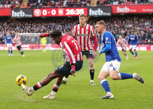Andre Brooks of Sheffield United clears the ball up field during the Sky Bet Championship match Sheffield United vs Ipswich Town at Bramall Lane, Sheffield, United Kingdom, 24th January 2026, Credit:Richard Bierton/News Images / Avalon