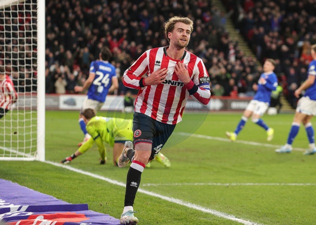 Patrick Bamford of Sheffield United celebrates his goal to make it 3-1 during the Sky Bet Championship match Sheffield United vs Ipswich Town at Bramall Lane, Sheffield, United Kingdom, 24th January 2026, Credit:Richard Bierton/News Images / Avalon