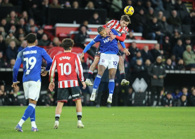 Sydie Peck of Sheffield United jumps up to win the high ball during the Sky Bet Championship match Sheffield United vs Ipswich Town at Bramall Lane, Sheffield, United Kingdom, 24th January 2026, Credit:Richard Bierton/News Images / Avalon