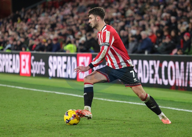 Thomas Cannon of Sheffield United in action during the Sky Bet Championship match Sheffield United vs Ipswich Town at Bramall Lane, Sheffield, United Kingdom, 24th January 2026, Credit:Richard Bierton/News Images / Avalon