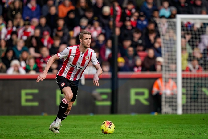 Kristoffer Ajer of Brentford makes a run with the ball during the Premier League match Brentford vs Nottingham Forest at The Gtech Community Stadium, London, United Kingdom, 25th January 2026, Credit:Maynard Manyowa/News Images / Avalon