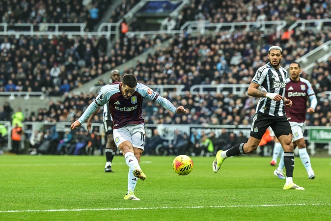 Emi Buendia of Aston Villa scores to make it 0-1 during the Premier League match Newcastle United vs Aston Villa at St. James's Park, Newcastle, United Kingdom, 25th January 2026, Credit:Mark Cosgrove/News Images / Avalon