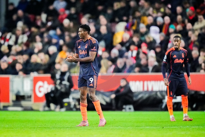 Taiwo Awoniyi of Nottingham Forest celebrates his goal to make it 0-2 during the Premier League match Brentford vs Nottingham Forest at The Gtech Community Stadium, London, United Kingdom, 25th January 2026, Credit:Maynard Manyowa/News Images / Avalon