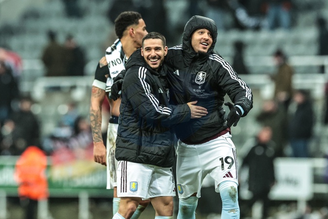 Emi Buendia of Aston Villa and Emi Buendia of Aston Villa celebrate the win during the Premier League match Newcastle United vs Aston Villa at St. James's Park, Newcastle, United Kingdom, 25th January 2026, Credit:Mark Cosgrove/News Images / Avalon