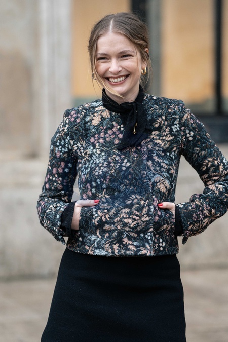 Camille Razat wears colored floral tapestry jacket with a black velvet bow detail, a black mini skirt, outside Patou Menswear Fall/Winter 2026-2027 show as part of Paris Fashion Week on January 25, 2026 in Paris, France., Credit:Lounis Tiar / Avalon