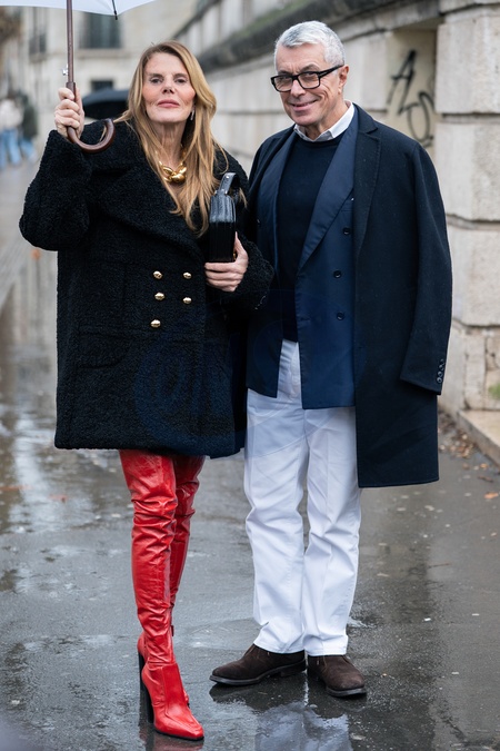 Anna Dello Russo (L) wears black Patou fur short coat, red over the knees leather boots, black bag, gold chain necklace, and Giorgio Guidotti (R) wears, white shirt, navy sweater, blue blazer, white pants, black coat, brown boots (R), outside Patou Menswear Fall/Winter 2026-2027 show as part of Paris Fashion Week on January 25, 2026 in Paris, France., Credit:Lounis Tiar / Avalon
