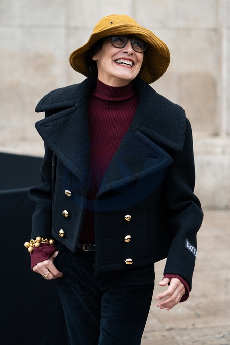 Inès de la Fressange wears red turtleneck sweater, black pants, black cropped coat, yellow bucket hat, outside Patou Menswear Fall/Winter 2026-2027 show as part of Paris Fashion Week on January 25, 2026 in Paris, France., Credit:Lounis Tiar / Avalon