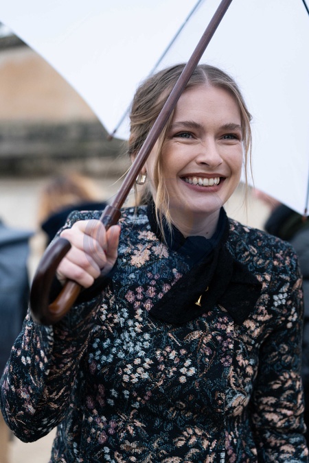 Camille Razat wears colored floral tapestry jacket with a black velvet bow detail, a black mini skirt, outside Patou Menswear Fall/Winter 2026-2027 show as part of Paris Fashion Week on January 25, 2026 in Paris, France., Credit:Lounis Tiar / Avalon
