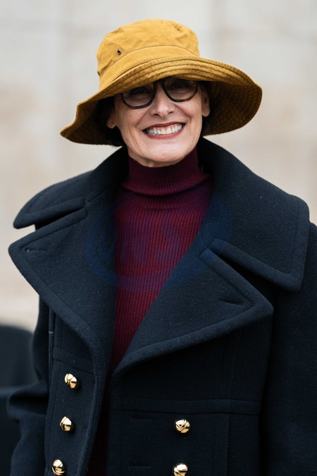 Inès de la Fressange wears red turtleneck sweater, black pants, black cropped coat, yellow bucket hat, outside Patou Menswear Fall/Winter 2026-2027 show as part of Paris Fashion Week on January 25, 2026 in Paris, France., Credit:Lounis Tiar / Avalon