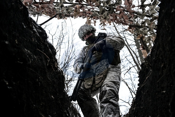 A soldier from a 2S22 Bohdana 155 mm self-propelled howitzer crew of the Striletskyi special forces police battalion of the National Police in the Zaporizhzhia region holds a pump-action rifle to protect the position from Russian drones in the Pokrovsky direction, Donetsk region, Ukraine, January 23, 2026., Credit:Dmytro Smolienko / Avalon