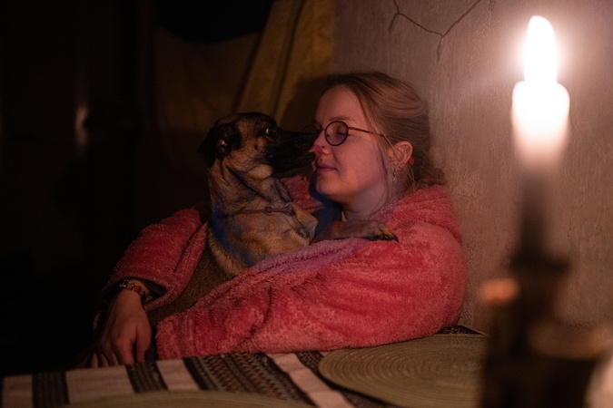 Valeriia, who lives in the Holosiivskyi district, in a pink bathrobe hugs a dog in the room lit by a candle during a power outage caused by regular Russian air strikes on the capital's energy infrastructure, Kyiv, Ukraine, January 23, 2026., Credit:Danylo Antoniuk / Avalon