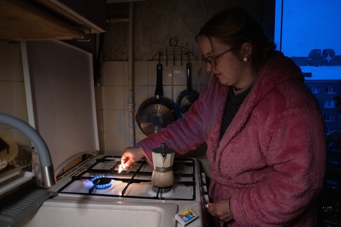 Valeriia, who lives in the Holosiivskyi district, lights a burner of a gas stove with a match to make coffee in a moka pot in the dimly lit kitchen during a power outage caused by regular Russian air strikes on the capital's energy infrastructure, Kyiv, Ukraine, January 23, 2026., Credit:Danylo Antoniuk / Avalon