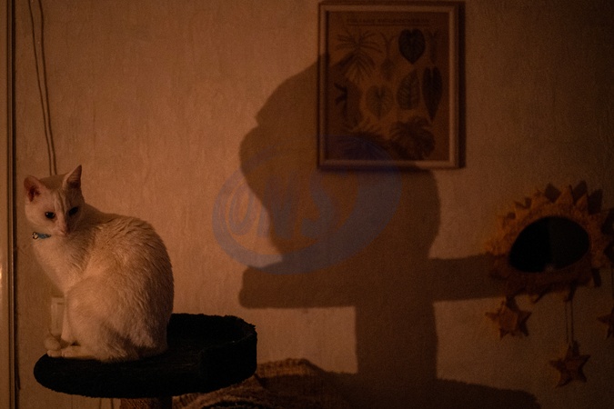 A white cat casts a shadow on the wall in the candlelight in the apartment of Valeriia, who lives in the Holosiivskyi district, during a power outage caused by regular Russian air strikes on the capital's energy infrastructure, Kyiv, Ukraine, January 23, 2026., Credit:Danylo Antoniuk / Avalon