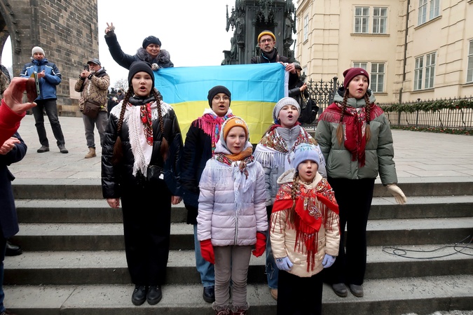 Children sing during the annual "Chain of Unity" marking Ukraine's Day of Unity, during which nearly 100 Ukrainians unfolded a 30-meter blue-and-yellow Ukrainian flag across Charles Bridge, uniting the two banks of the Vltava River, Prague, the Czech Republic, January 24, 2026., Credit:Olha Tanasiichuk / Avalon