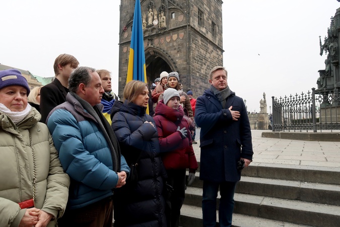 Ambassador Extraordinary and Plenipotentiary of Ukraine to the Czech Republic Vasyl Zvarych (R) listens to the national anthem during the annual "Chain of Unity" marking Ukraine's Day of Unity, during which nearly 100 Ukrainians unfolded a 30-meter blue-and-yellow Ukrainian flag across Charles Bridge, uniting the two banks of the Vltava River, Prague, the Czech Republic, January 24, 2026., Credit:Olha Tanasiichuk / Avalon
