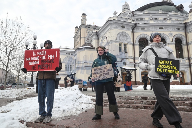 Demonstrators hold placards during the "Do Not Be Silent! Captivity Kills" rally to remind people about the prisoners of war from the Mariupol garrison, all captive and missing defenders of Ukraine outside the Taras Shevchenko National Academic Opera and Ballet Theatre in Kyiv, Ukraine, January 25, 2026., Credit:Pavlo Bahmut / Avalon