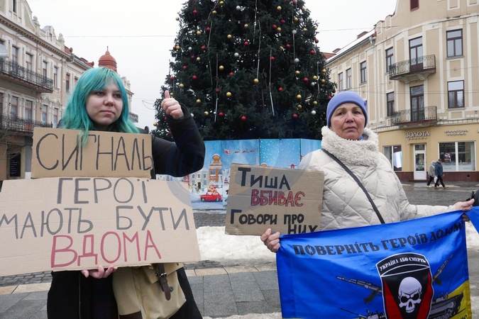 Activists hold placards and banners during the "Do Not Be Silent! Captivity Kills" rally to remind people about the prisoners of war from the Mariupol garrison, all captive and missing defenders of Ukraine in Shandora Petefi Square in Uzhhorod, Ukraine, January 25, 2026., Credit:Yulii Zozulia / Avalon