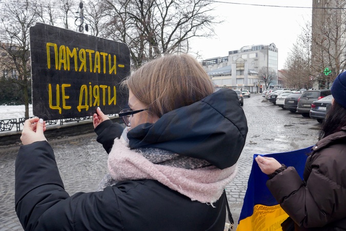 A demonstrator holds a placard reading "To Remember Means to Act" during the "Do Not Be Silent! Captivity Kills" rally to remind society about the prisoners of war from the Mariupol garrison, all captive and missing defenders of Ukraine in Shandora Petefi Square in Uzhhorod, Ukraine, January 25, 2026., Credit:Yulii Zozulia / Avalon